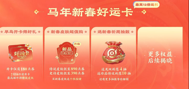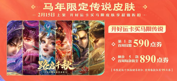 马年好运卡将于2月15日上线,价格依旧是180点券。开卡后的首款年限皮肤仅为590点券,之后5款皮肤均为890点券,其他关联新史诗皮肤每款价格为390点券,新传说皮肤为890点券,另外还会赠送4次无双祈愿抽奖,10次珍品传说祈愿抽奖。