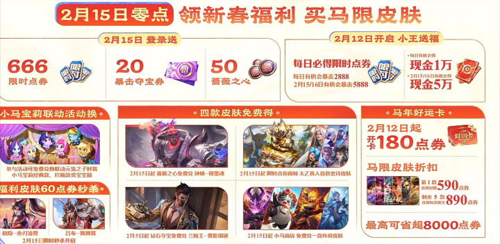 马年新春活动终于在2月4日晚的直播中爆料,10大福利活动全部亮点,蔷薇珍宝阁、小马商店、好运60卡、限时点券玩法全部回归,16款新皮肤里有4款可白嫖,接下来我把这些活动全部整理出来,方便大家观看。(省流版本在最后)