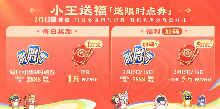 小王送福属于限时点券福利升级活动,2月12日起除了每日保底的限时点券收益之外,还有机会暴击获取额外点券,最高有机会拿到2888限时点券。2月15日到16日有机会暴击拿到5888点券,希望大家都是锦鲤附体!
