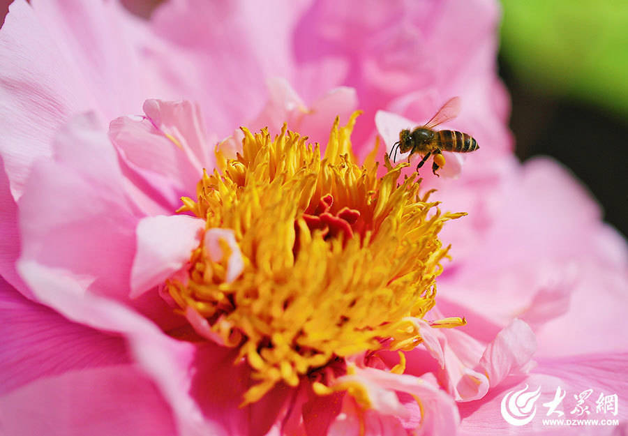 粉牡丹的金蕊是天然蜜源,小蜜蜂一头扎进花芯,开启忙碌的采蜜日常(摄影:李鹏)