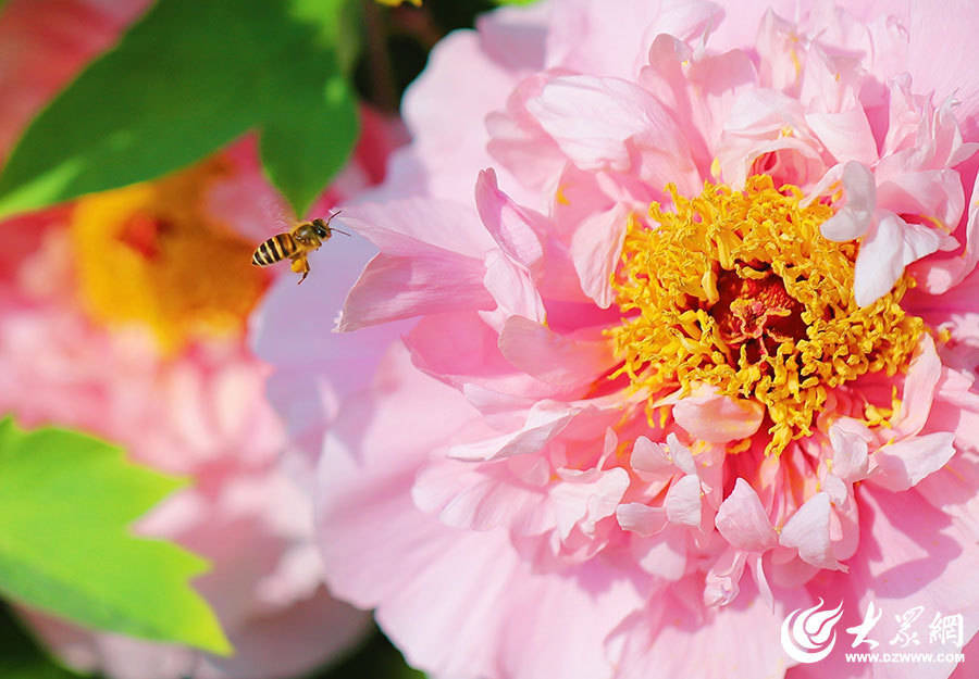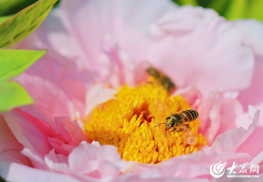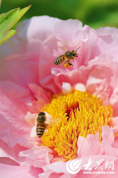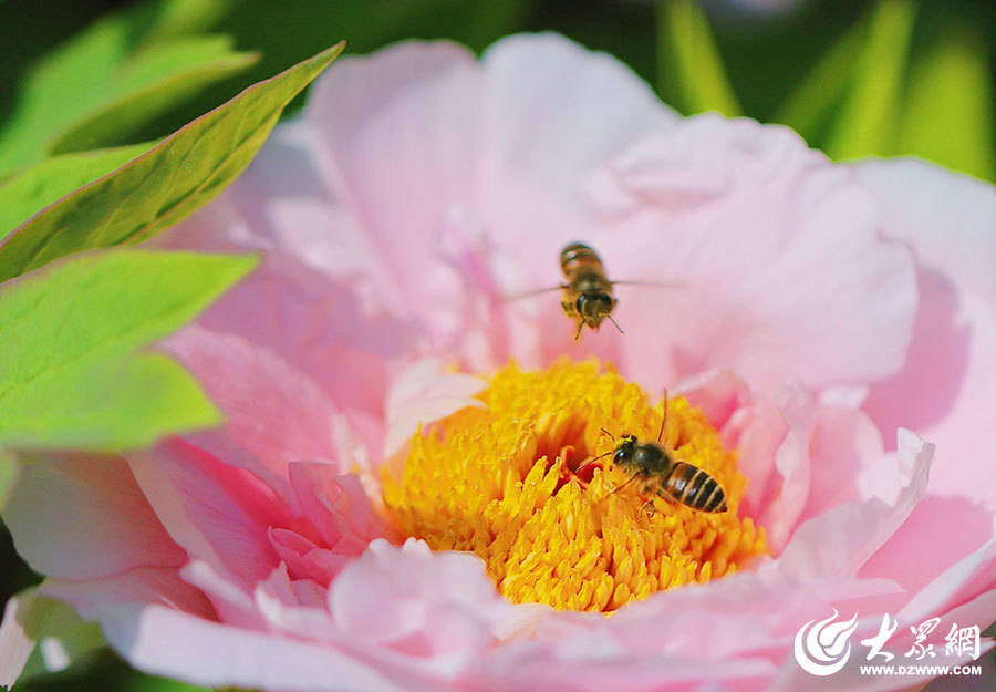 两只蜜蜂在牡丹花间飞舞,金蕊藏蜜,粉瓣含香,是春日最美的相遇(摄影:李鹏)