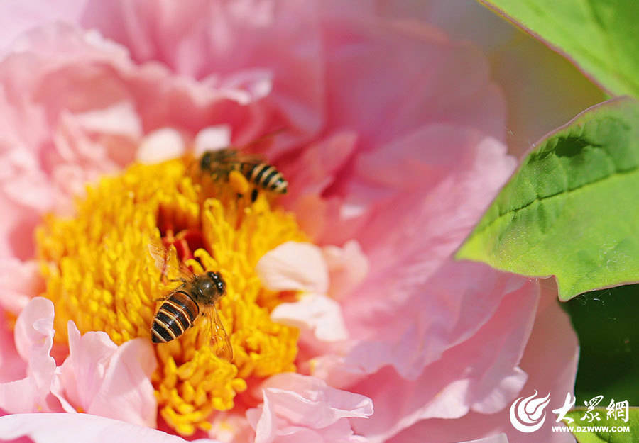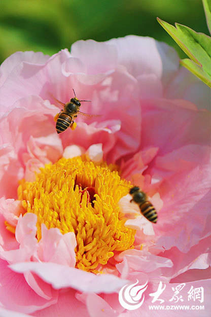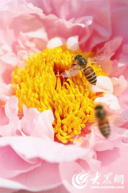 双蜂绕着牡丹金蕊采蜜,粉瓣舒展,春意盎然,定格自然之美(摄影:李鹏)