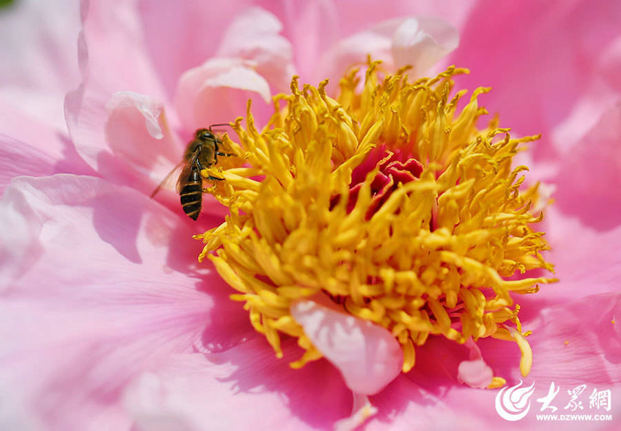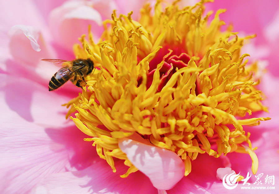 蜜蜂在牡丹金蕊间忙碌,粉花映蜂影,是四月里最动人的生态瞬间(摄影:李鹏)