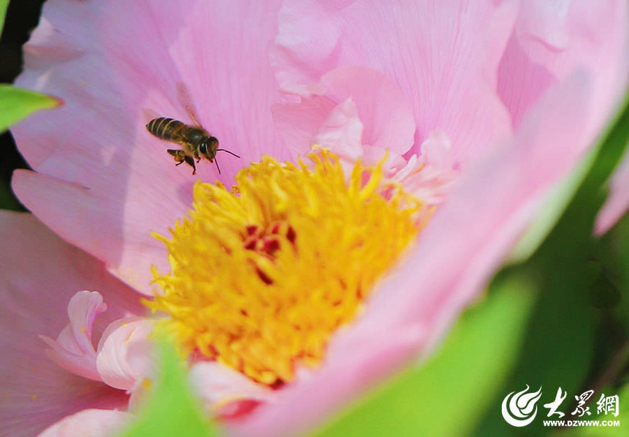 春日牡丹开,粉瓣舒展,金蕊盛放,迎来第一只采蜜的小蜜蜂(摄影:李鹏)